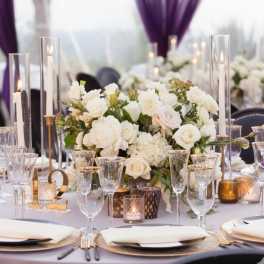 Price: $350.00Luxury White Garden Rose & Dahlia Centerpiece with Gold Accents